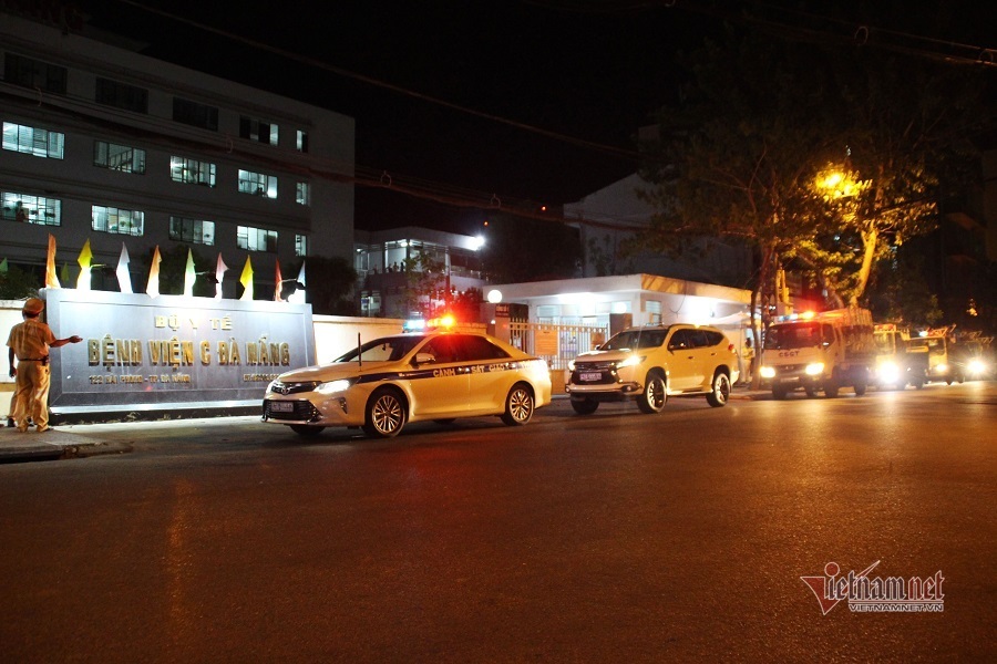 Trong đêm cảnh sát kéo chắn barrier phong tỏa các nút giao thông ở xung quanh bệnh viện Đà Nẵng và bệnh viện C để phòng chống dịch Covid-19.